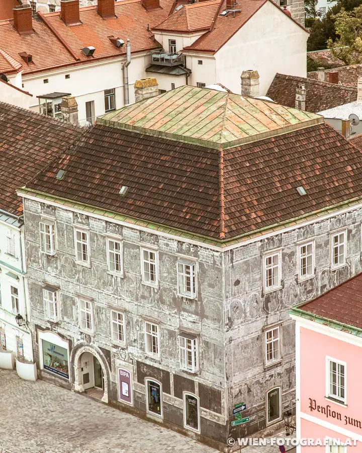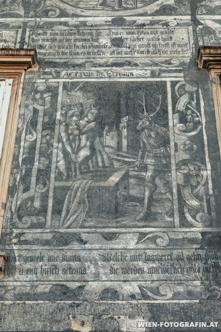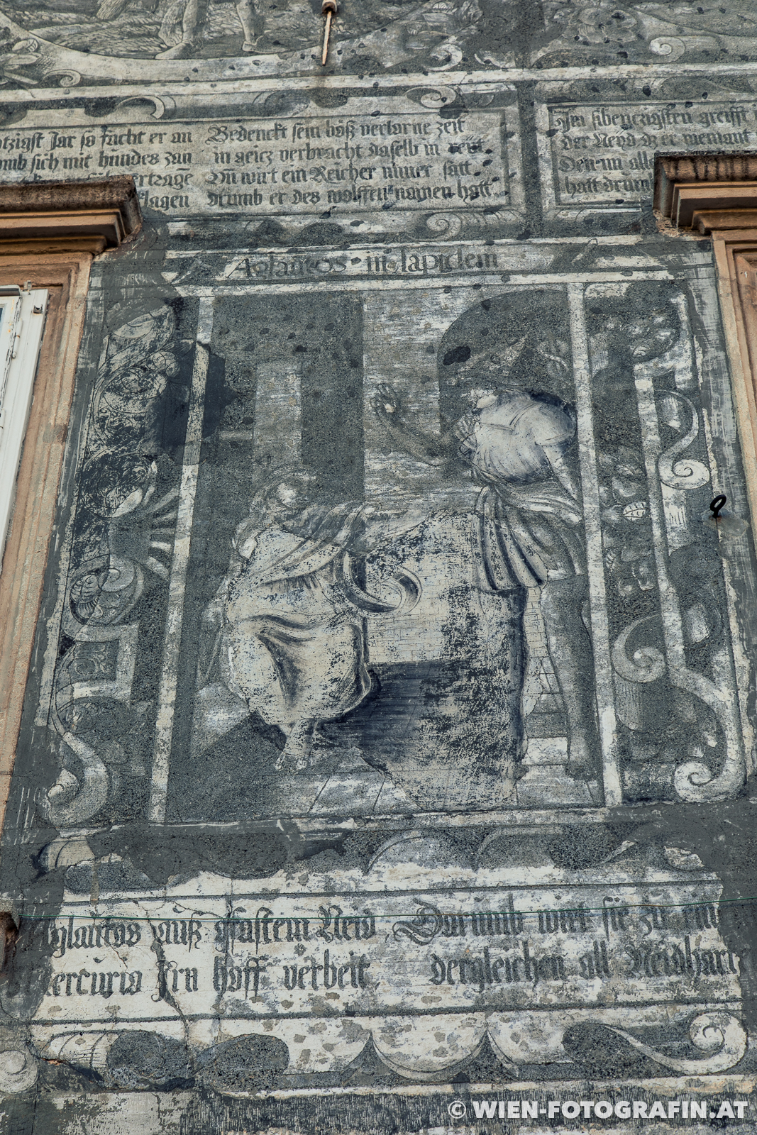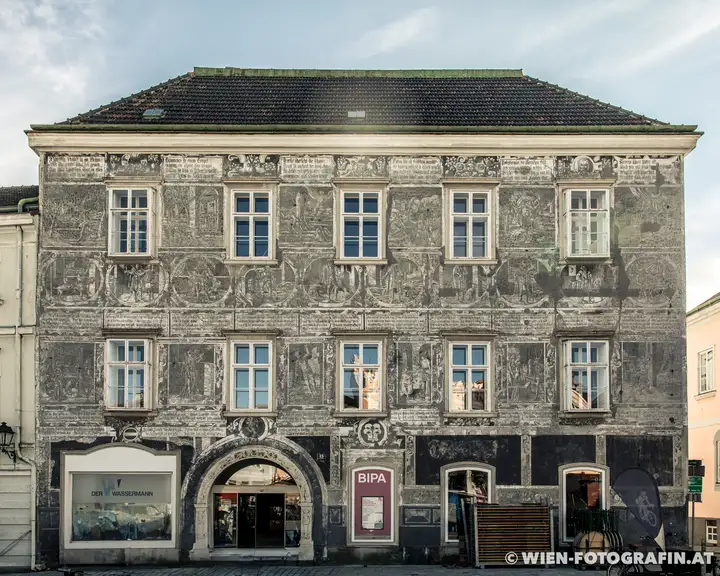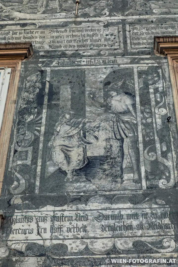 Das Haus wurde mit einer besonderen Technik aus Italien verziert: Sgraffito – dabei werden mehrere Putzschichten aufgetragen und in die oberste Schicht Bilder eingeritzt. Die Darstellungen zeigen Szenen aus dem Alten Testament (Kremserstraße), der griechischen Mythologie (Hauptplatz) sowie symbolische Lebensbilder mit Tieren.