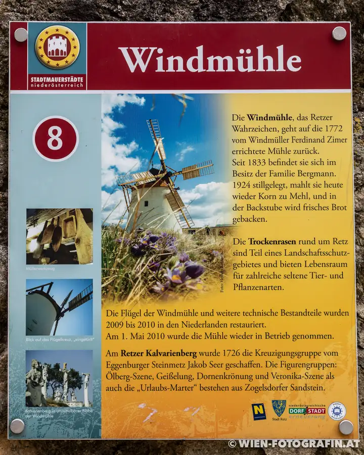 Die Retzer Windmühle zählt zu den letzten wieder betriebsfähigen Windmühlen Österreichs – neben jener in Podersdorf. Einst gab es rund 400 solcher Mühlen im Land. Sie steht auf einer Anhöhe zwischen Retz und dem Manhartsberg, unweit von Kalvarienberg und Soldatenfriedhof.